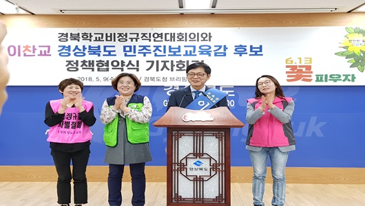 이 자리에서 이찬교 경북 교육감 예비후보는 “학교비정규직은 공교육에서 아주 중요한 역할을 하고 있다. 학생들이 공부하고 뛰어놀 수 있는 여건을 조성하고, 아이들에게 건강하게 자라날 수 있도록 건강한 식사를 제공하는 등 학교의 숨은 곳곳에서 일하는 학교비정규직 노동자들이 더 이상 부당한 차별을 받지 않도록 노력하겠다.”고 다짐했다.