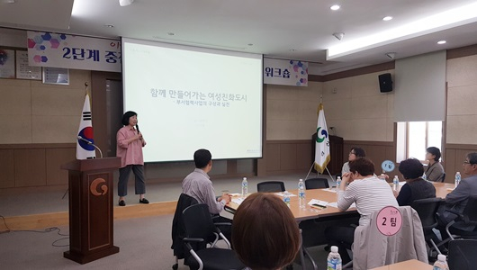 이미원 여성친화도시 컨설턴트인의 ‘부서가 참여하는 여성친화도시’ 특강과 1단계 57개 사업에 대한 잘된 점과 아쉬운 점을 서로 가감 없이 평가하고, 경산시에 딱맞는 2단계 중점과제를 발굴하는 모둠활동 순으로 진행됐다.