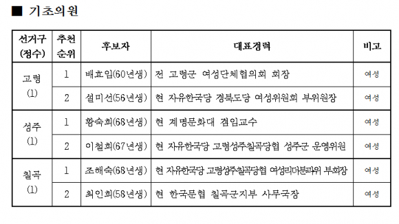 [경북=경북IT뉴스] 자유한국당 경북도당 공천관리위원회는 5월 16일 제23차 회의를 거쳐 고령, 성주, 칠곡 비례대표 후보를 발표했다.