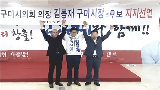 [구미=경북IT뉴스] 김봉재 무소속 구미시장 예비후보 사무소에서 지난 5월 21일 자유한국당 허복 전 예비후보와 전인철 전 구미시의회 의장, 윤종석 전 구미시의회 부의장, 김성조 전국회의원 강형우 보좌관, 더불어민주당 김철호 전 구미시장 예비후보 사무장 등 지지자 100여명이 모인 가운데 지지 선언식이 열렸다.