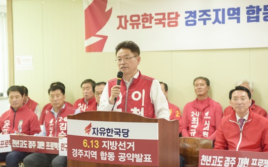 [경주=경북IT뉴스] 이철우 자유한국당 경북도지사 후보는 5월 29일 경주 용강동에 위치한 자신의 선거사무소에서 주낙영 경주시장 후보, 자유한국당 경주지역 도의원 및 시의원 후보들, 김석기 경북도당위원장과 함께 경주지역 합동 공약발표 기자회견을 개최했다.