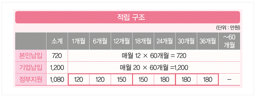 적립구조는 청년재직자·기업·정부가 공동으로 공제금을 적립하고, 공제만기(5년) 시 적립금 전액을 청년재직자가 수령하는 구조다. 적립금은 청년재직자 월 12만원 이상(5년 적립), 기업 월 20만원 이상(5년 적립), 정부 월 30만원(최대 3년 적립)으로 설계되어 있으며, 공제만기 시 청년재직자는 3,000만원을 손에 쥘 수 있다.