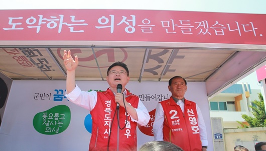 문경 모전천변에서 열린 유세에서 이 후보는 문경지역 현안사업인 안동 도청신도시로 가는 도로개설에 대해 “도지사와 시장, 기초 및 광역의원 후보자를 모두 빨간색 2번을 찍어주면 그 약속 지키겠다”며 지지를 당부했다.