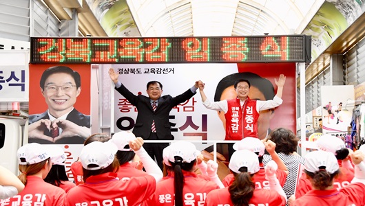 이어 새마을중앙시장으로 자리를 옮긴 임종식 후보는 장규열 상임공동선대위원장과 시장 중앙광장에서 유세차에 올라 공동유세전을 펼치며 구미시민들의 적극적인 지지를 호소했다.