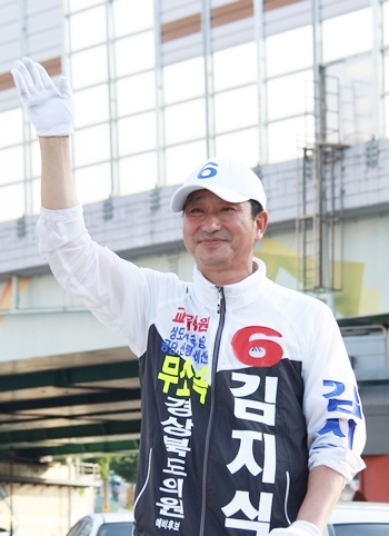 무소속 김지식 경상북도의원(제3선거구-상모사곡동, 임오동, 공단 1·2동, 신평 1·2동, 비산동) 후보가 지난 6월 8일 임은 삼거리에서 유세를 펼치며 지지를 호소했다.
