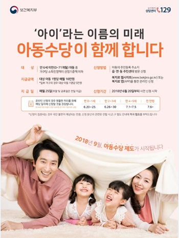한편, 9월말에 아동수당을 신청하는 경우에는 소득조사 등 처리 기간을 거쳐 11월에 9월분부터 소급하여 지급한다. 아동수당관련 각종 서식과 작성방법 등은 아동수당 홈페이지(www.ihappy.or.kr)에서 확인할 수 있으며, 소득 인정액 간편계산도 가능하다. |