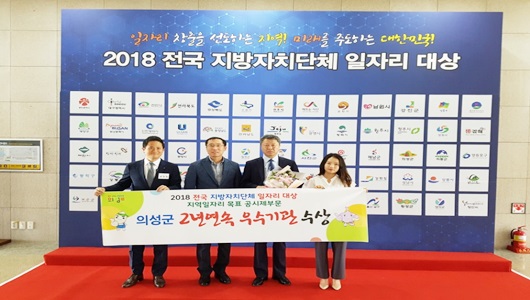 [의성=경북IT뉴스] 의성군은 6월 20일 정부세종컨벤션센터에서 개최된 ‘2018년 전국 지방자치단체 일자리대상’ 시상식에서일자리 목표 공시제 부문에서 2년 연속 우수기관으로 선정되어 수상의 영예를 안았다.