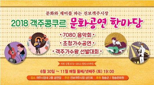 [청송=경북IT뉴스] 청송군은 오는 6월 30일 진보객주시장 2층 특설무대에서 ‘객주콩쿠르’가 개막한다고 밝혔다. 동해의 해산물과 육지의 농산물이 만나는 보부상 장터 ‘진보객주시장’ 활성화를 위한 ‘객주콩쿠르’는 11월초까지 매월 둘째, 넷째 주 토요일 총 10회에 걸쳐 진행된다.