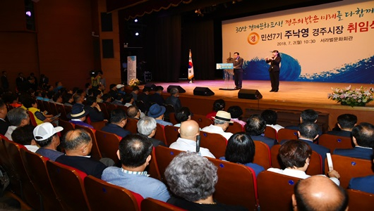 한편 주 시장은 취임사를 통해 민선7기 핵심 시정방향으로 ▲30만 경제문화도시, ▲한국의 로마 ‘경주’, ▲쾌적하고 아름다운 도시, 걷기 좋은 도시, ▲명품 교육과 행복하고 안전한 삶 ▲젊은이가 돌아오는 부자 농어촌, ▲소통, 공감, 화합의 열린 시정 등 6개 분야를 제시했다.