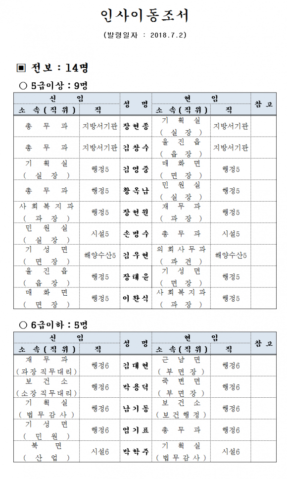 [울진=경북IT뉴스] 울진군은 7월 2일 6급이상 14명에 대한 인사를 단행했다.