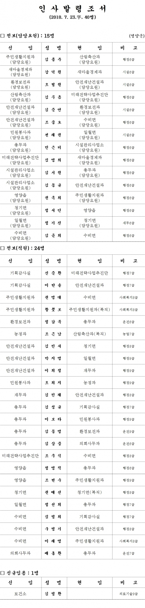 [영양=경북IT뉴스] 영양군이 7월 23일자로 6급 이하 40명에 대한 인사발령을 단행했다.