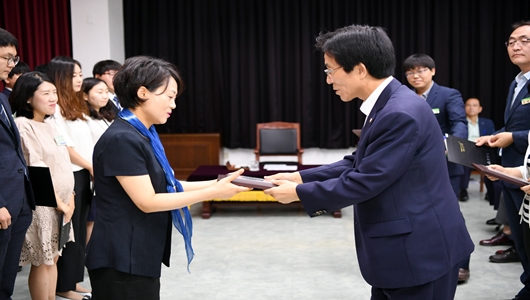[문경=경북IT뉴스] 문경시는 1일 대회의실에서 열린 정례조회에서 신기제2일반산업단지 기업유치에 도움을 준 공무원 김미자 농촌지도사(문경시 농업기술센터)와 박영규 주무관(경제진흥과)에게 유공 표창패를 수여했다. 김미자 농촌지도사는 식품박람회 등에서 자주 만나오던 ㈜삼미식품이 문경시 오미자를 이용한 소스를 개발하고 싶다는 회사 측 이야기를 듣고 신기제2일반산업단지에 투자하는데 가교역할을 한 공로로 표창패를 받았다.