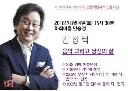 (재)세계유교문화재단에서는 SBS 명예예술단장인 김정택 선생을 초빙, 오는 4일 오후 3시30분부터 만송정에서 인문학콘서트를 개최한다고 밝혔다.