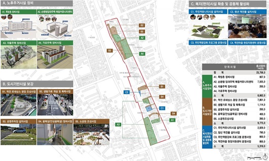 추진전략은 ▲노후 주거시설 정비, ▲도시기반시설 보강, ▲복지시설 확충 및 주민공동체 활성화 등 3가지 추진전략을 마련했으며, 단위사업으로는 자율주택 정비 등 소규모 주택정비사업과 순환형 임대주택 복합커뮤니티센터 조성 사업 등 주거시설 정비사업, 역전 르네상스 광장, 생활가로 개설, 공영주차장, 소공원 등 도시기반시설 사업, 주민커뮤니티시설, 청년 역전몰, 주민역량강화 프로그램, 역전마을 현장지원센터 등 복지시설과 주민공동체 활성화 사업으로 계획해 추진할 예정이다.