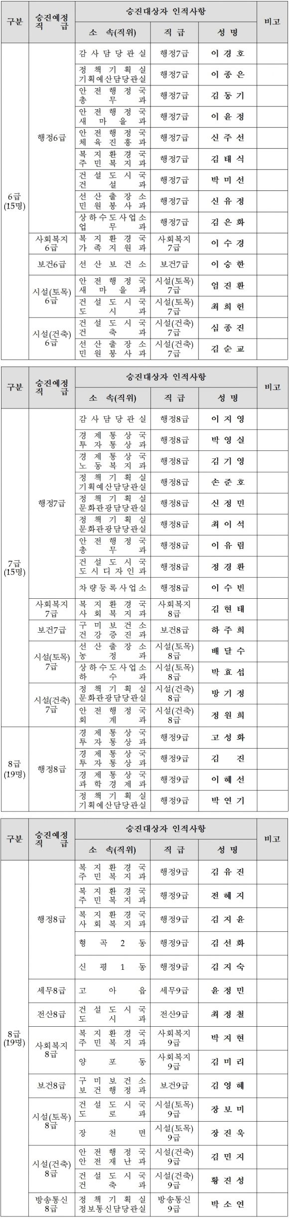 [구미=경북IT뉴스] 구미시는 8월 30일자 6,7,8급 승진의결자 명단을 발표했다.