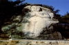 ㆍ경북 구미시 황상동 산 90-14 ㆍ지정번호 보물 제1122호 ㆍ지정일자 1992년 1월 15일 구미 황상동 마애여래입상은 속칭 석현이라 불리는 고갯길 좌측으로 솟아있는 암벽전면에 조각된 높이 7.3m의 여래입상이다. 암면이 고르지 못하고 균열과 박락이 심하지만 보존상태는 비교적 양호한 편이다. 암벽 위에는 별도의 판석을 얹어 불상의 머리 부분을 덮고 있다. 이는 야외에 노출된 고려시대 불상에서 흔히 나타나는 형태이다. 불상은 바위의 굴곡을 따라 자연스럽게 조각하여 전체적으로 율동적인 느낌을 주지만 자세는 정제되지 않고 부자연스럽다. 큼직한 육계가 솟아있는 소발의 머리에 둥글고 풍만한 얼굴은 거의 비만형에 가깝다. 가늘게 뜬 눈 위에 간격을 두고 새겨진 초승달 모양의 눈썹은 작고 편평한 코의 윤곽선과 연결되었고, 작고 굳게 다문 입술밑에는 주름진 아래턱을 표현하여 근엄한 인상을 풍기고 있다. 두 귀는 어깨위로 길게 드리워져 있으며, 짧은 목에는 삼도가 표현되었다. 풍만한 신체 역시 비만형에 가깝고 특히 하반신을 둔중하고 비대하게 강조하고 있음은 고려시대 마애불의 공통된 특징이라 할 수 있다. 법의는 통견으로 얇게 밀착되어 신체의 굴곡을 드러내고 있으며, 의습선은 대체로 형식적으로 처리한 경향이 강한데 특히 하반신에 표현된 옷주름은 다리의 굴곡을 따라 형식화된 의문을 반복하여 시대적 특징을 반영하고 있다. 수인(손의 모양)은 두 손을 가슴 위로 올리고 왼손은 손등이 보이도록 엄지와 소지를 대고, 오른손은 손바닥이 보이도록 엄지와 검지를 맞대고 있으나 표현이 어색하고 부자연스럽다. 그리고 복련의 대좌 위에 새겨진 두 발은 특이하게 발끝이 바깥쪽으로 향하도록 표현하였다. 전체적인 조각 수법으로 볼 때 고려시대의 조각 양식이 잘 반영되어 있어 10세기 이후의 작품으로 추정된다. 전설에 의하면 백제군에게 쫓기던 당나라의 장수가 어느 여인의 도움으로 이 바위 뒤에 숨어 목숨을 구하였는데, 그 여인은 간 곳이 없었다 한다. 그 여인이 부처님이라고 생각한 장수가 이 바위에 불상을 조각했다는 이야기가 전한다. ◆ 자료제공 : 구미문화원 |