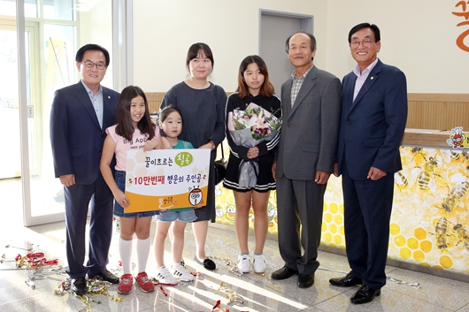 지난 3월 문을 연 꿀벌나라 테마공원에는 평일 평균 200여 명, 주말에는 1200여 명의 관람객이 방문하면서 지난 18일에 곽윤정(40세, 구미 상모)씨 가족이 10만 번째 관람객으로 테마공원을 방문했다.
