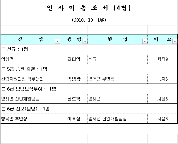 10월 1일자 4명