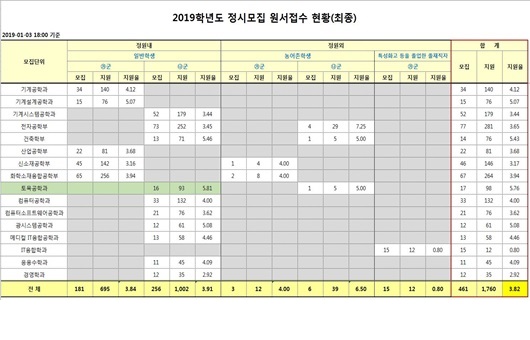 [구미=경북IT뉴스] 금오공과대학교(총장 이상철)는 지난 3일 ‘2019학년도 정시모집’ 원서 접수를 마감한 결과, 461명 모집에 총 1,760명이 지원해 평균 3.82대 1의 경쟁률을 보였다.