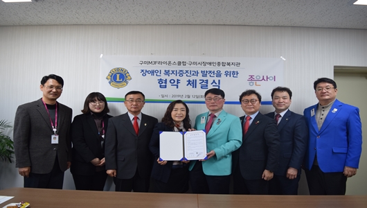 [구미=경북IT뉴스] 구미MJF라이온스클럽(회장 박추용)과 구미시장애인종합복지관(관장 김숙희)이 12일 구미시장애인종합복지관 관장실에서 장애인 복지증진과 발전을 위한 업무협약을 체결했다.