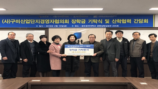 한편, 장학금 전달식에 이어 열린 LINC+사업단과 (사)구미산업단지경영자협의회와의 간담회에서 양 기관은 사회협력 선도대학 사업 활성화를 위해 지역사회 공헌 활동을 함께 진행하기로 협의했다.