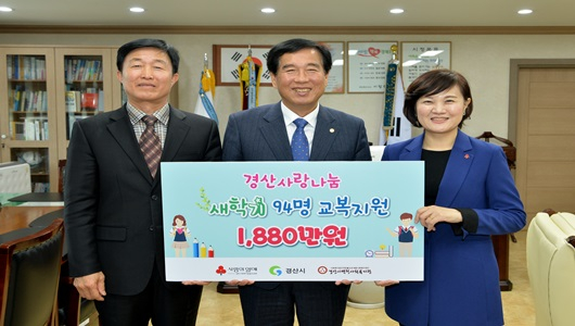 [경산=경북IT뉴스] 경산시(시장 최영조)는 경산사랑나눔에서 2월 20일 2019년 새 학기를 맞이해 고등학교 진학 자녀가 있는 저소득 가정 94가구에 가구당 동복 교복비 20만원 총 1,880만 원을 지원했다.