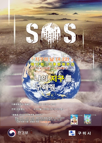 [구미=경북IT뉴스] 구미시는 오는 22일 ‘지구의 날’을 맞아 19일부터 25일까지 ‘제11회 기후변화주간’으로 정하여 올해 기후주간의 메시지인 ‘SOS, 나의 지구를 구해 줘!’라는 주제로 ▷기후변화주간 홍보 캠페인 ▷지구를 위한 10분 소등행사 ▷기후변화 관련 영화상영 등 행사를 추진한다.