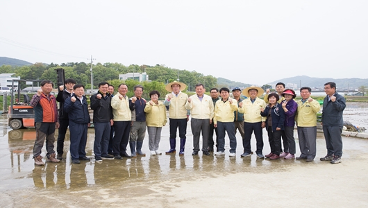[구미=경북IT뉴스] 2019년 구미시의 첫 모내기가 23일 선산읍 이문리 430-1외 4필지 13,200㎡의 논에서 진행됐다.