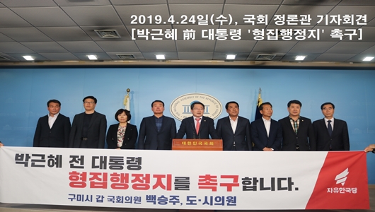 백 의원과 김상조, 윤창욱 경북도의원, 김재상 구미시의회 부의장, 권재욱, 김낙관, 김춘남, 장세구 구미시의원 등은 24일 국회 정론관에서 기자회견을 열고 박근혜 전 대통령 '형집행정지' 촉구 성명서를 발표했다.