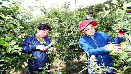 [안동=경북IT뉴스] 권영세 안동시장이 시청직원, 농협중앙회 안동시지부 및 와룡농협 임직원 등 30여 명과 함께 31일 와룡면 지내리 과수농가를 찾아 사과적과 작업을 도왔다.