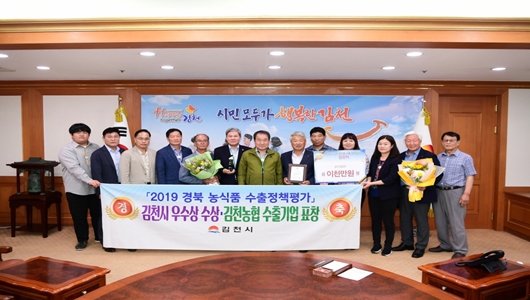 [김천=경북IT뉴스] 김천시가 지난 21일 안동 그랜드호텔에서 열린 2019년 경북 농식품 수출촉진대회에서 농식품 수출정책 시군평가에서 2년 연속우수상을 받았다.