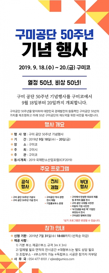 한편, 구미국가산업단지는 지난 1969년 9월16일 공업단지 조성 실시계획 인가일을 기준으로 올해 ‘구미공단 조성 50주년’이 되는 뜻 깊은 해이다.