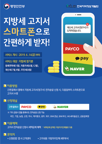 대상세목은 재산세(7월,9월), 주민세(8월), 자동차세(6월,12월), 등록면허세(1월)이며 모바일 전자송달 서비스는 해당 간편결제사 앱과 시중은행, 금융결제원 등의 금융앱을 통해서 신청할 수 있다.