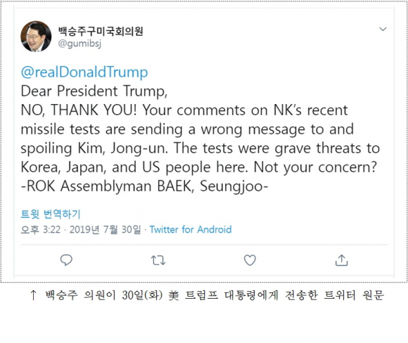 [구미=경북IT뉴스] 국회 국방위원회 자유한국당 간사 백승주 국회의원(경북 구미갑)은 “지난 25일 북한의 중거리탄도미사일 시험 발사가 명백한 유엔안보리결의 위반임에도 불구하고 트럼프 대통령이 ‘위협이 되지 않는다’ 등의 북한의 도발 위협을 축소한 것에 직접적으로 유감을 표명하는 메시지를 트위터를 통해 전송했다”고 밝혔다.