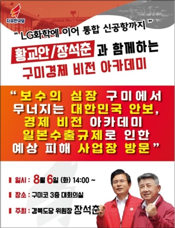 자유한국당 경북도당 위원장 장석춘 의원(경북 구미시을)은 오는 6일 오후 2시, 구미코 3층 대회의실에서 개최되는 ‘황교안·장석춘과 함께하는 구미경제 비전 아카데미’에서 황 대표가 경북 구미을 당협 소속 당원들을 대상으로 특강을 한 후, 일본수출규제 여파로 불안해하고 있을 지역 기업체를 방문해 애로사항을 청취 할 예정이라고 밝혔다.