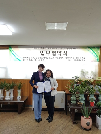 (사)경북장애인부모회구미시지부(조현자 지부장), 구미혜당학교(박현숙 교장)는 14일 구미관내 장애인학생가정을 대상으로 장애인가족역량강화를 위한 부모교육, 비장애형제자매지원, 정서지원에 관한 협조, 장애인가족기능보완을 위한 일시 돌봄, 자조모임지원, 평생교육에 관한 협조, 지역사회연계를 위한 자원연계, 장애인인식개선 및 홍보 활동에 관한 협조, 기타 장애인가족 재능나눔활동사업의 협력운영 및 자문에 대한 협조사항 등을 목적으로 협약했다.