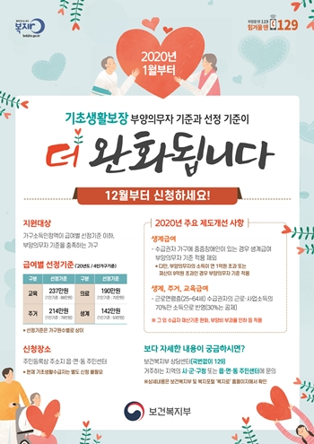 2020년 완화된 기초생활보장사업 주요내용은 생계급여 4인기준 138만4천원에서 142만5천원으로 전년대비 2.94% 인상되었고, 일하는 수급자들(25세~64세)의 근로·사업소득 30%를 공제해 생계급여 수준을 향상시켜 일하는 수급자에 대한 지원을 강화한다.