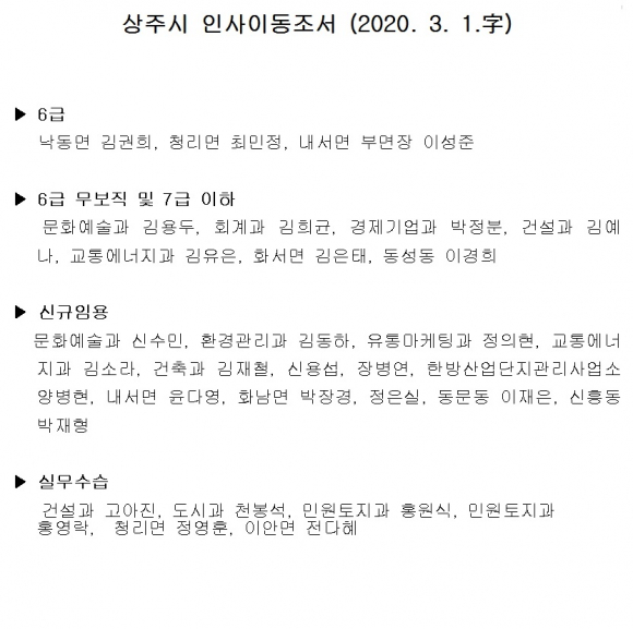 [상주=경북IT뉴스] 상주시는 2020년 3월 1일자 인사이동조서를 발표했다.