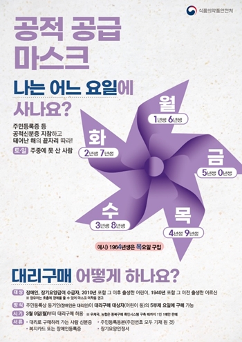 출생연도 끝자리를 기준으로 월요일은 1·6, 화요일은 2·7, 수요일은 3·8, 목요일은 4·9, 금요일은 5·0이며, 주중에 구매하지 못한 경우 주말에는 출생연도에 구애받지 않고 구매할 수 있다.
