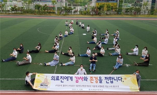 교사들도 “지난 4개월 동안 코로나 19로 학교도 비상이어서 매우 힘들었는데 최전선에서 일하는 의료진들은 얼마나 힘들지 상상이 안 될 정도다. 미약하나마 이렇게 응원을 할 수 있어서 기쁘고, 의료진들께 정말 감사드린다”고 말했다.