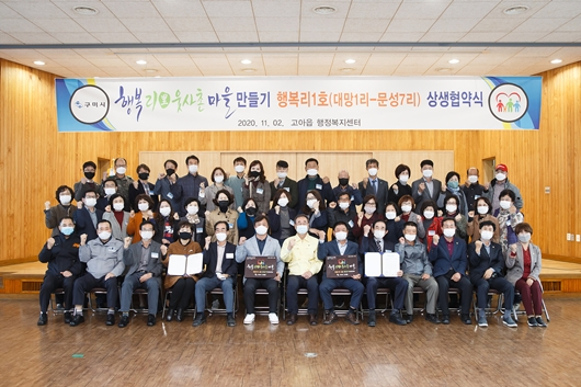 이 날 협약식은 읍승격 23주년을 맞아 장세용 구미시장, 도‧시의원 및 읍 기관단체장, 대망1리와 문성7리 마을관계자 60여명이 참석한 가운데 경과보고, 상생협약, 행복리1호 현판 수여식 순으로 행사가 진행됐다.