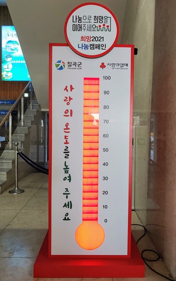 [칠곡=경북IT뉴스] 칠곡군은 ‘희망2021 나눔캠페인’ 목표액인 4억 2천만 원을 달성해 캠페인 시작 42일 만에 목표액을 조기 달성하고 사랑의 온도탑에 100도를 점등하는 쾌거를 이뤘다.