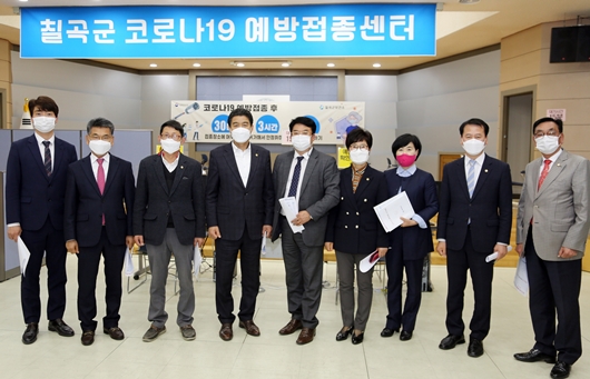 이날 칠곡군 의원들은 코로나19 백신접종계획에 대한 보고를 받은 뒤 예방접종센터 현장을 점검하며 근무자들의 노고에 감사의 인사를 전했다.