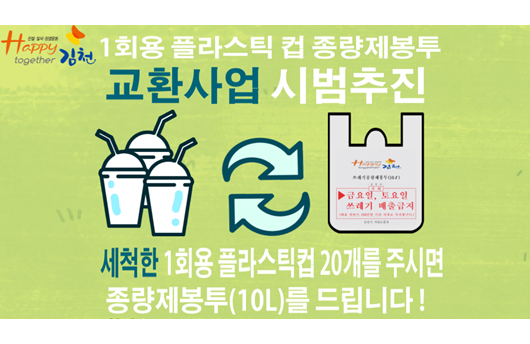 일회용 플라스틱 컵 20개를 가져가면 10ℓ 종량제봉투 1매로 교환해준다. 1회용 플라스틱 컵 재활용이 목적이며, 컵 안의 내용물을 버리고 물로 세척해야 한다.