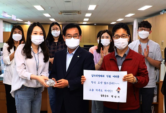 백선기 군수는 “본연의 업무 외에도 코로나 대응 업무로 위기 상황을 극복하기 위해 최선을 다해주는 직원 분들의 헌신적인 노력에 진심으로 감사하다” 며 “코로나로 어렵고 힘든 상황들이 계속되지만, 조금 더 힘을 내고, 서로 의지해 극복해 나가자”고 당부했다.