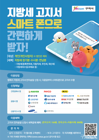 [구미=경북IT뉴스] 구미시는 시민의 납세 편의를 위해 우편으로 배달되는 종이고지서 대신 시민들이 친숙하게 사용하는 네이버, 카카오톡, 페이코 등 스마트폰 앱을 통해 지방세 고지서를 받아보고 간편하게 세금을 납부할 수 있는 '지방세 모바일 고지 납부 서비스' 를 시행하고 있다고 밝혔다.