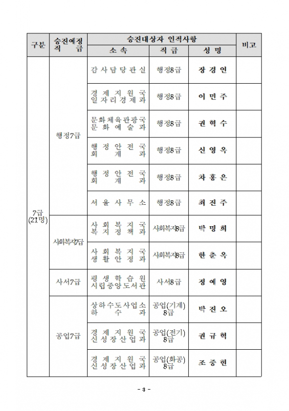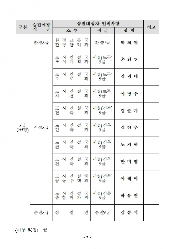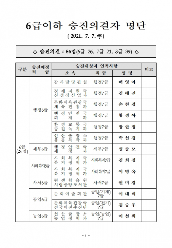 2021년 7월 7일자, 총 86명( 6급 26명, 7급 21명, 8급 39명)