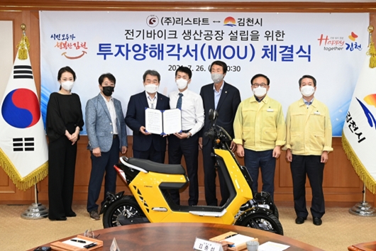 [김천=경북IT뉴스] 김천시는 지난 26일 친환경 모빌리티 전문기업인 (주)리스타트(대표 정기문)와 전기바이크 생산을 위한 투자양해각서(MOU)를 체결했다.