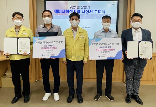 [김천=경북IT뉴스]김천시(시장 김충섭)는 지난 27일 2021년 상반기 예비 사회적기업 신규지정 기업 2개소(사회적협동조합 한국장기요양지원센터, 농업회사법인 주식회사 위드베리)에 지역형 예비사회적기업 지정서를 전달했다.