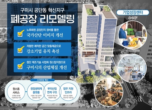 구미시는 지난달 30일 사업지구 지정 이후 1년 반만에 LH와 공동 사업시행자로한 변경계획의 국토교통부 승인에 이어, 산업통상자원부의 국비 공모사업인 ‘2021년 산업단지 휴폐업공장 리모델링 사업’2차 공모에 최종 선정돼 국비 70억원을 확보했다고 5일 밝혔다.